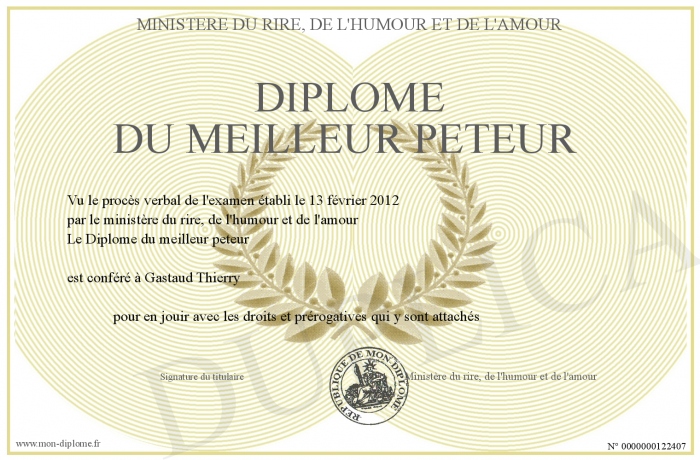 Envoyez par email votre Diplome du meilleur peteur personalisé