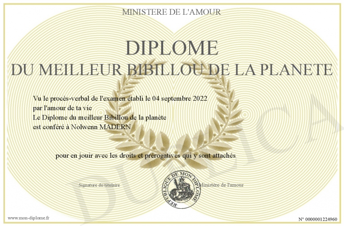 Envoyez par email votre Diplôme du meilleur Bibillou de la planète personalisé