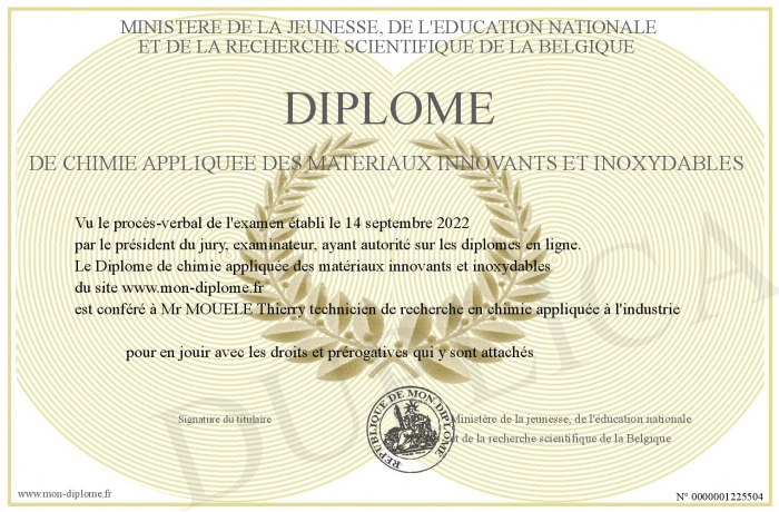 Envoyez par email votre Diplôme de chimie appliquée des matériaux innovants et inoxydables personalisé