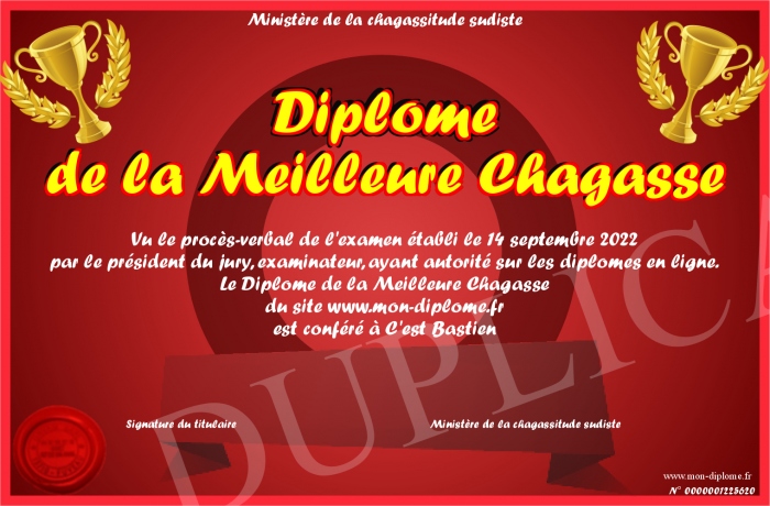 Envoyez par email votre Diplôme de la Meilleure Chagasse personalisé