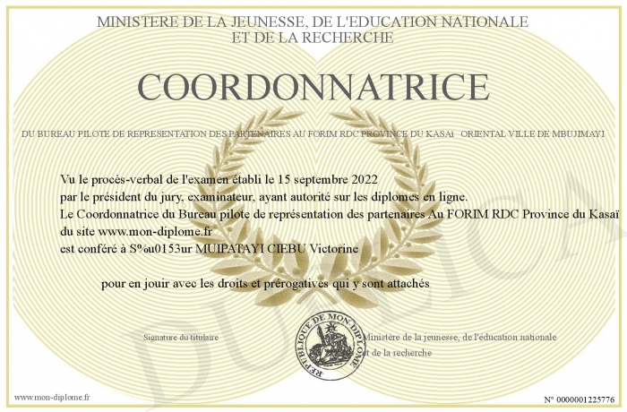 Envoyez par email votre Coordonnatrice du Bureau pilote de représentation des partenaires Au FORIM RDC Province du Kasaï Oriental ville de Mbujimayi personalisé