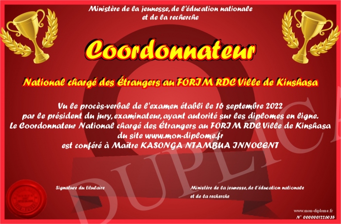 Envoyez par email votre Coordonnateur National chargé des Étrangers au FORIM RDC Ville de Kinshasa personalisé