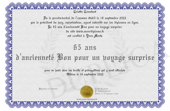 Envoyez par email votre 65 ans d'ancienneté Bon pour un voyage surprise personalisé