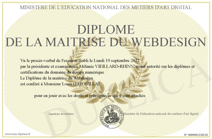 Envoyez par email votre Diplôme de la maitrise du Webdesign personalisé