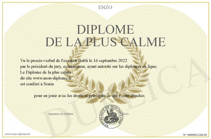 Envoyez par email votre Diplôme de la plus calme personalisé