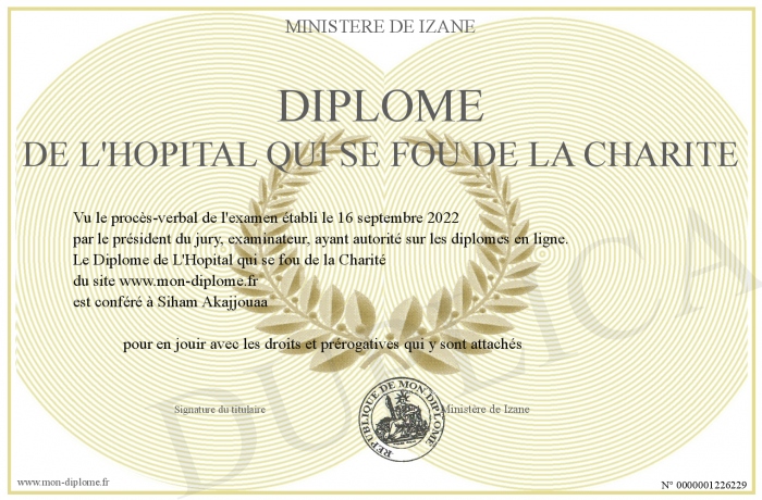 Envoyez par email votre Diplôme de L'Hopital qui se fou de la Charité personalisé