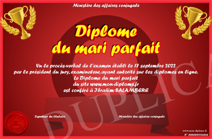 Envoyez par email votre Diplôme du mari parfait personalisé
