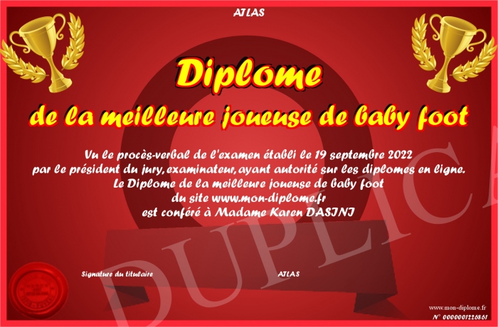 Envoyez par email votre Diplôme de la meilleure joueuse de baby foot personalisé