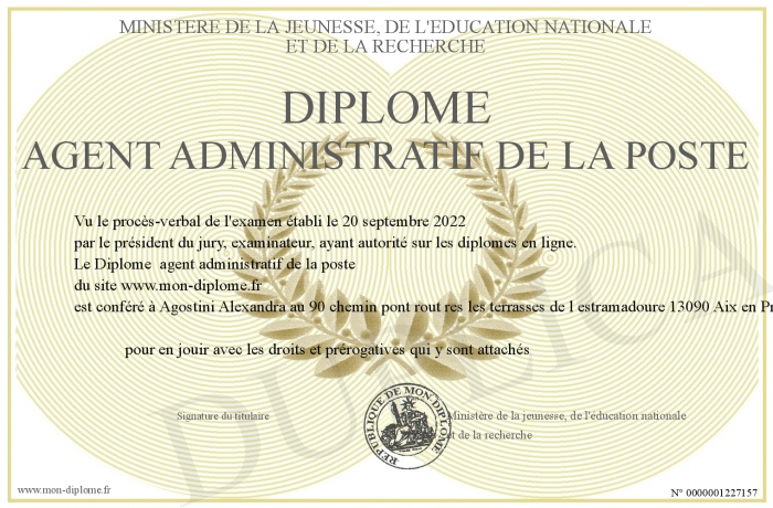 Envoyez par email votre Diplôme agent administratif de la poste personalisé