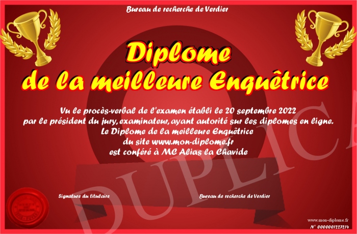 Envoyez par email votre Diplôme de la meilleure Enquêtrice personalisé