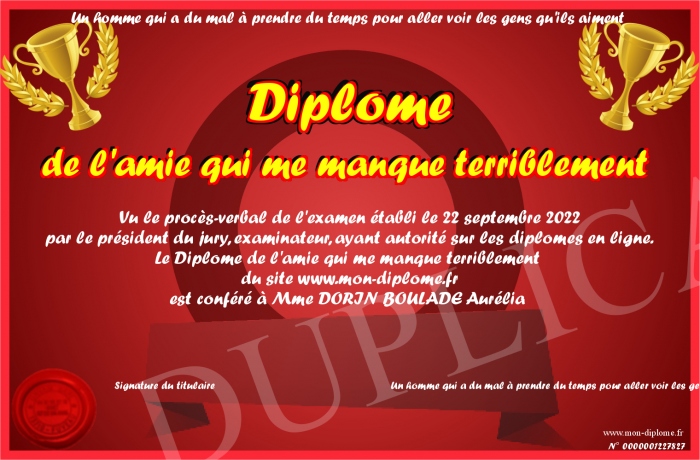 Envoyez par email votre Diplôme de l'amie qui me manque terriblement personalisé