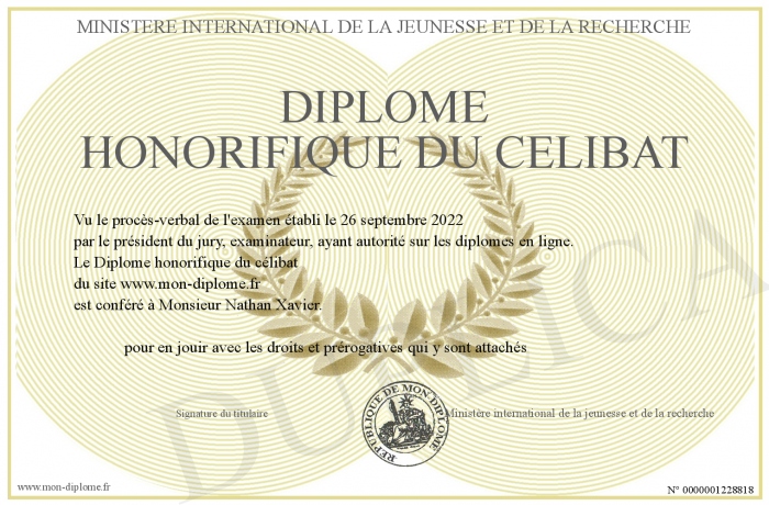 Envoyez par email votre Diplôme honorifique du célibat personalisé