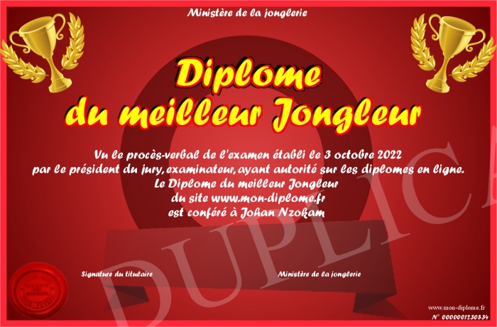 Envoyez par email votre Diplôme du meilleur Jongleur personalisé