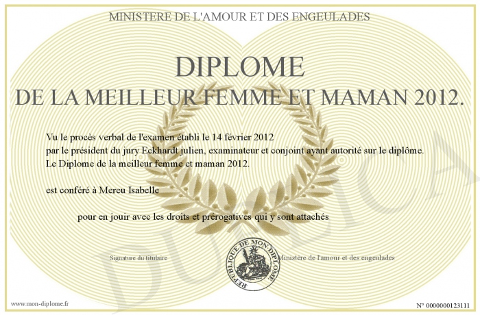 Envoyez par email votre Diplôme de la meilleur femme et maman 2012. personalisé