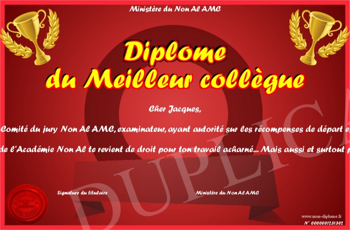 Envoyez par email votre Diplôme du Meilleur collègue personalisé