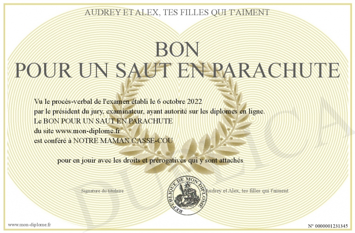 Envoyez par email votre BON POUR UN SAUT EN PARACHUTE personalisé