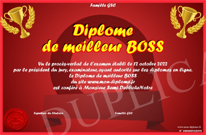 Envoyez par email votre Diplôme de meilleur BOSS personalisé