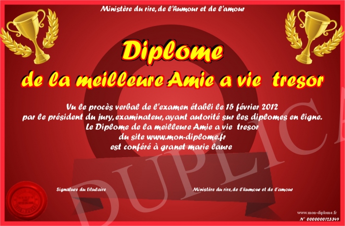 Envoyez par email votre Diplome de la meilleure Amie a vie tresor personalisé