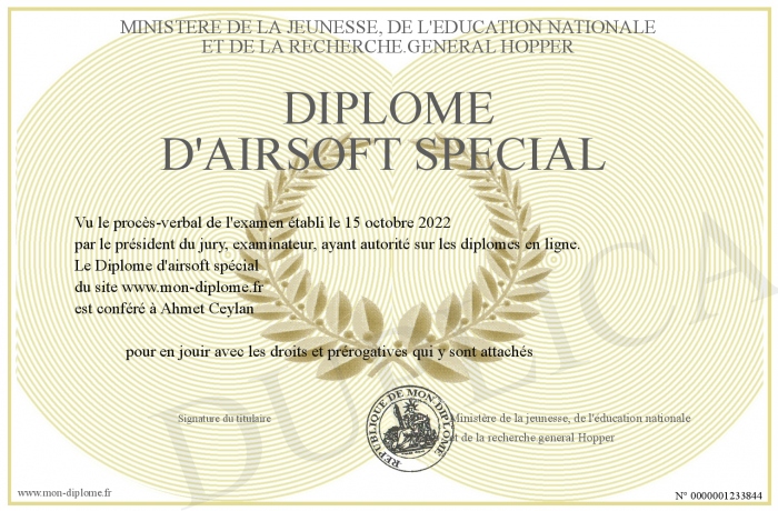 Envoyez par email votre Diplôme d'airsoft spécial personalisé
