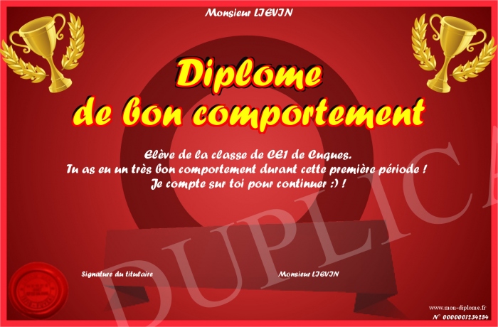 Envoyez par email votre Diplôme de bon comportement personalisé