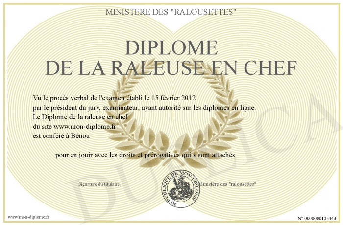 Envoyez par email votre Diplôme de la raleuse en chef personalisé