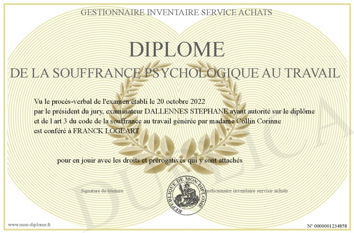 Envoyez par email votre Diplôme de la souffrance psychologique au travail personalisé