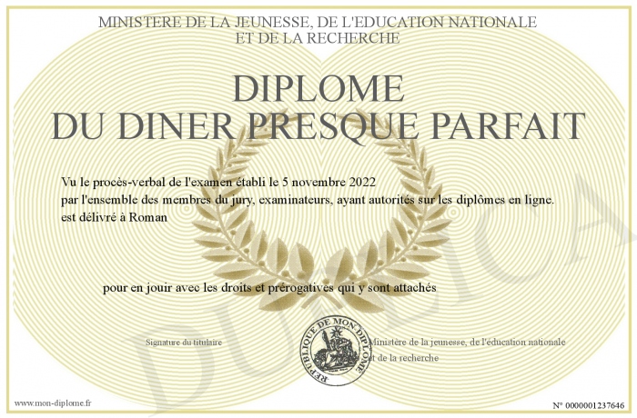 Envoyez par email votre Diplôme du diner presque parfait personalisé
