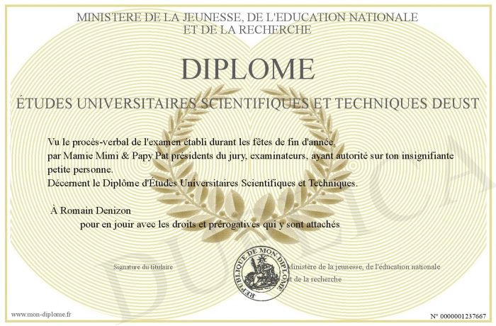 Envoyez par email votre Diplôme Études Universitaires Scientifiques et Techniques DEUST personalisé