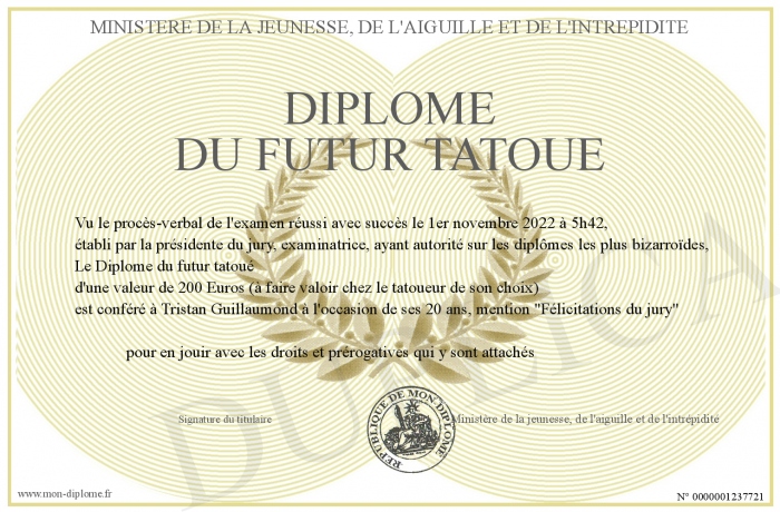 Envoyez par email votre Diplôme du futur tatoué personalisé