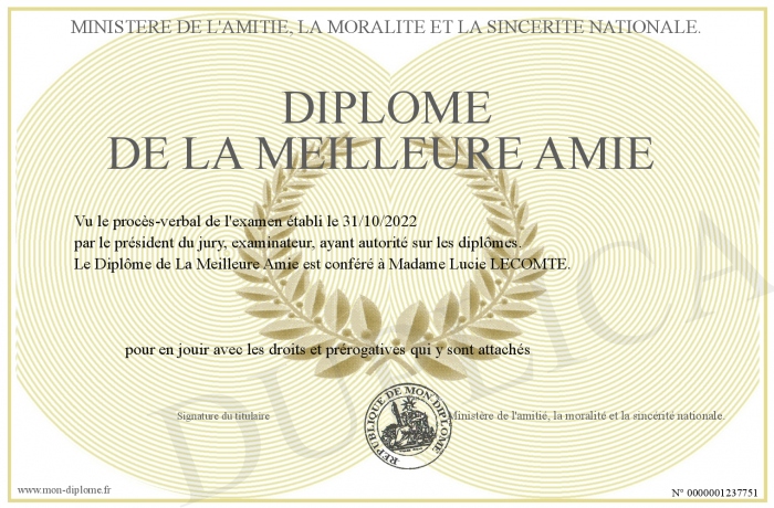 Envoyez par email votre Diplôme de LA MEILLEURE AMIE personalisé
