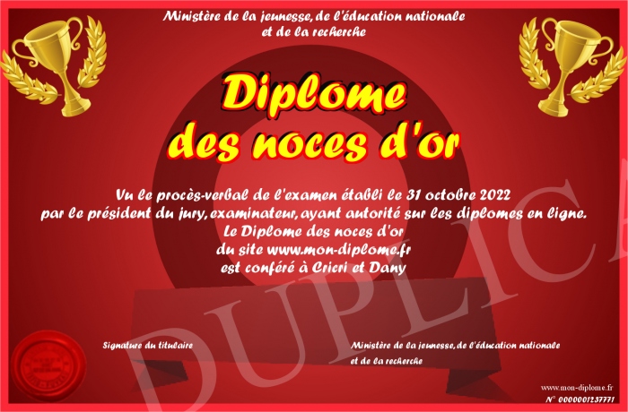 Envoyez par email votre Diplôme des noces d'or personalisé