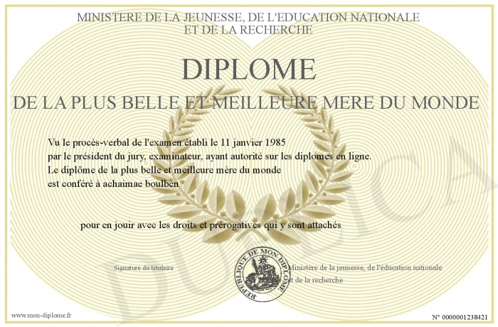 Envoyez par email votre Diplôme de la plus belle et meilleure mère du monde personalisé
