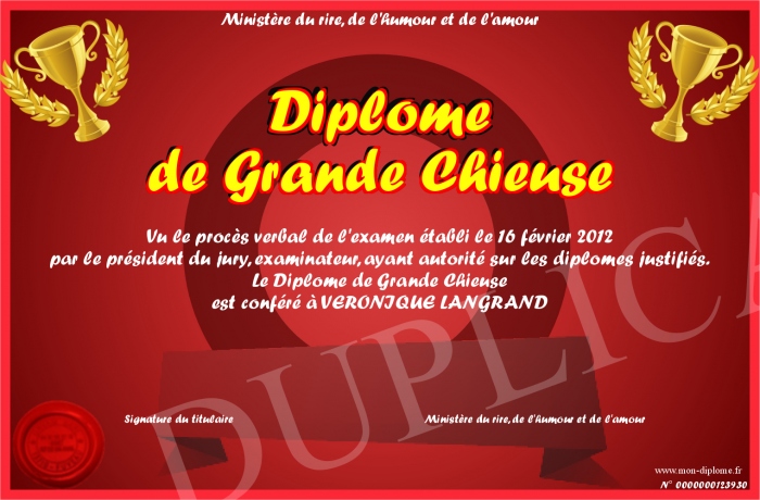 Envoyez par email votre Diplome de Grande Chieuse personalisé