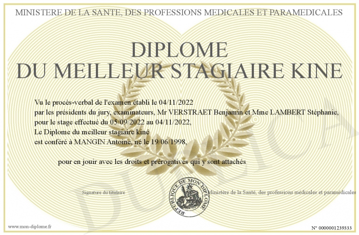 Envoyez par email votre Diplôme du meilleur stagiaire kiné personalisé