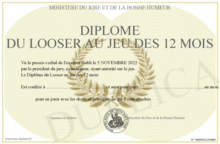 Envoyez par email votre Diplôme du Looser au jeu des 12 mois personalisé