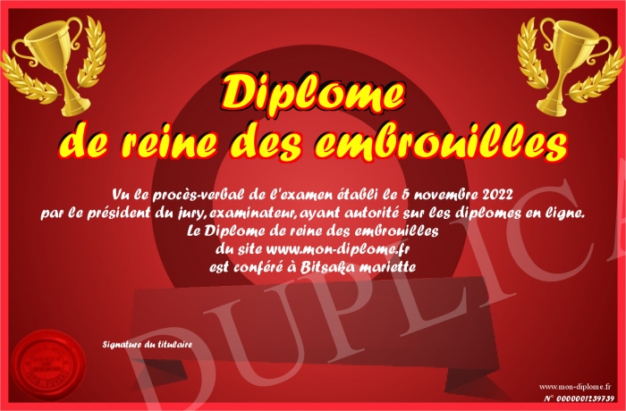 Envoyez par email votre Diplôme de reine des embrouilles personalisé