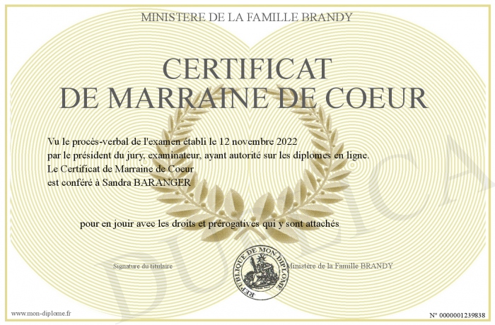 Envoyez par email votre Certificat de Marraine de Coeur personalisé