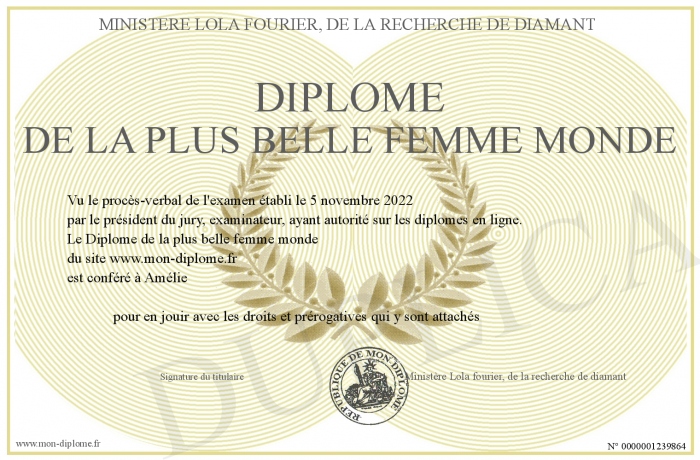 Envoyez par email votre Diplôme de la plus belle femme monde personalisé