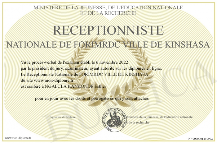 Envoyez par email votre Réceptionniste Nationale de FORIMRDC VILLE DE KINSHASA personalisé