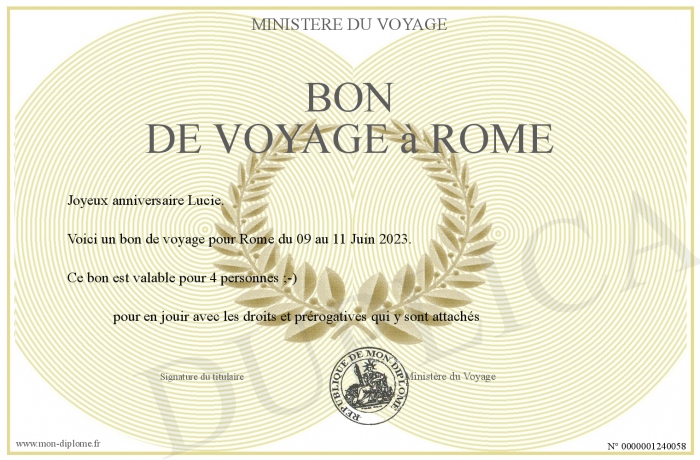 Envoyez par email votre BON de Voyage à ROME personalisé