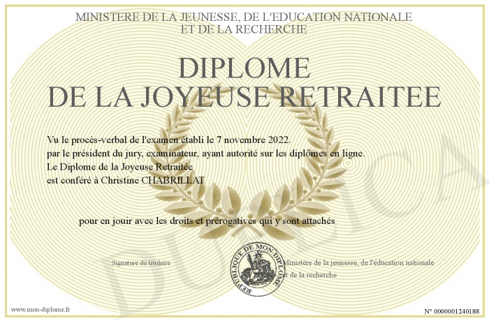Envoyez par email votre Diplôme de la Joyeuse Retraitée personalisé