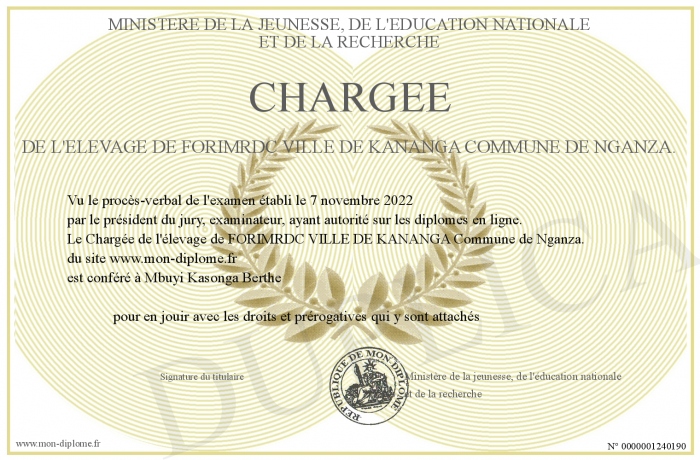 Envoyez par email votre Chargée de l'élevage de FORIMRDC VILLE DE KANANGA Commune de Nganza. personalisé