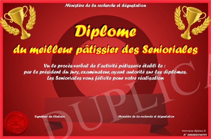 Envoyez par email votre Diplôme du meilleur pâtissier des Senioriales personalisé