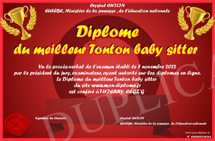 Envoyez par email votre Diplôme du meilleur Tonton baby sitter personalisé