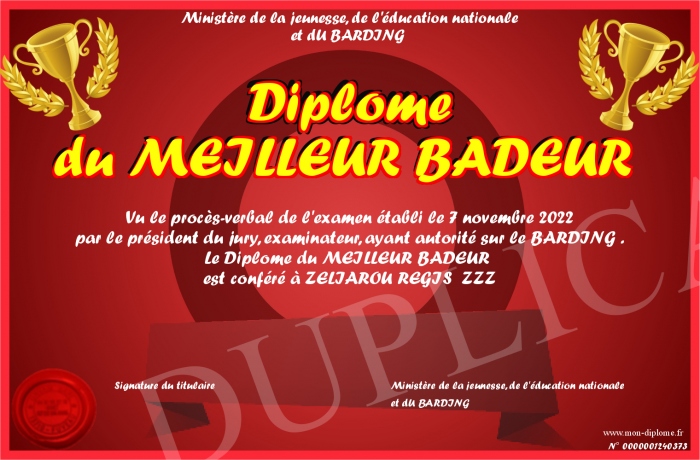 Envoyez par email votre Diplôme du MEILLEUR BADEUR personalisé