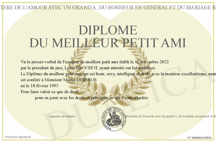 Envoyez par email votre Diplôme du meilleur petit ami personalisé