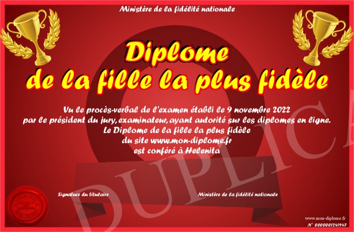 Envoyez par email votre Diplôme de la fille la plus fidèle personalisé