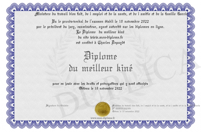 Envoyez par email votre Diplôme du meilleur kiné personalisé