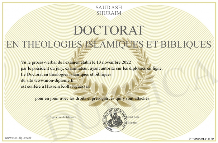 Envoyez par email votre Doctorat en théologies islamiques et bibliques personalisé