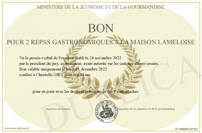 Envoyez par email votre Bon pour 2 repas gastronomiques A la maison lameloise personalisé